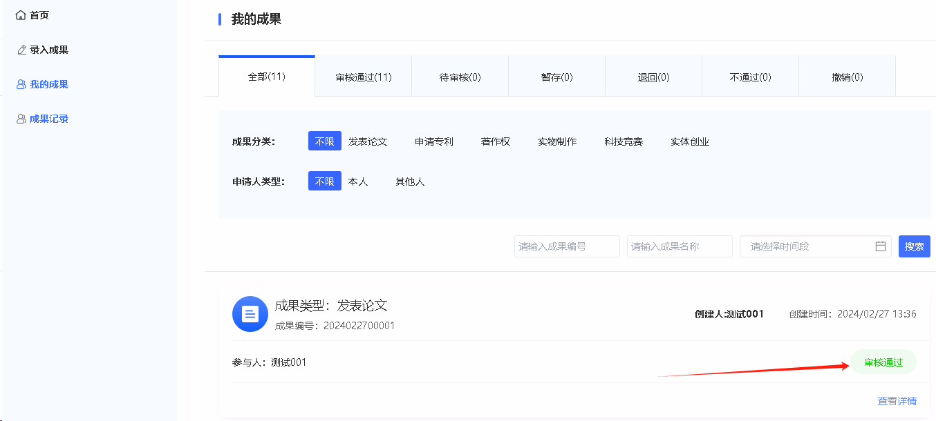 在“我的成果”查看成果的审核状态。