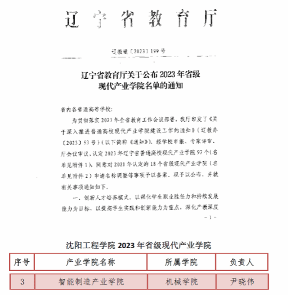 近日,辽宁省教育厅发布《辽宁省教育厅关于公布2023年省级现代产业学院名单的通知》(辽教通〔2023〕199号),学校共获批4项。其中我院推荐申报的智能制造产业学院获批2023年省级现代产业学院。