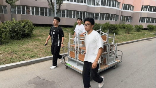 清晨阳光还未完全升起,五彩斑斓的迎新横幅和牌匾装点着机械学院的迎新场地,营造出浓厚的欢迎氛围蓄势待发准备迎接着新同学的到来