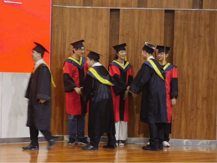 机械学院副院长白斌宣读授位决定。最后机械学院毕业生代表上台为教师献花、合影留念。